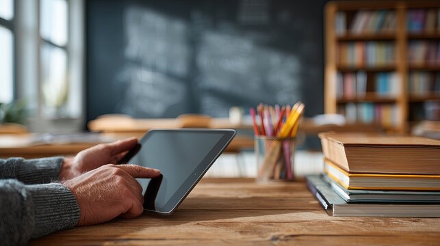 A person using a tablet on a wooden desk. Nearby are stacks of books and colorful pencils in a classroom setting. Natural light illuminates the space.