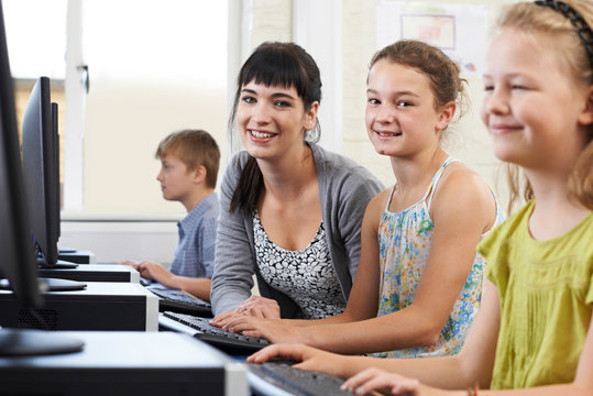 Portrait Of Elementary Pupils In Computer Class With Teacher