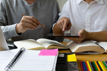 Students helps friend teaching and learning subject additional in library. using tablet to the education . education concept.
