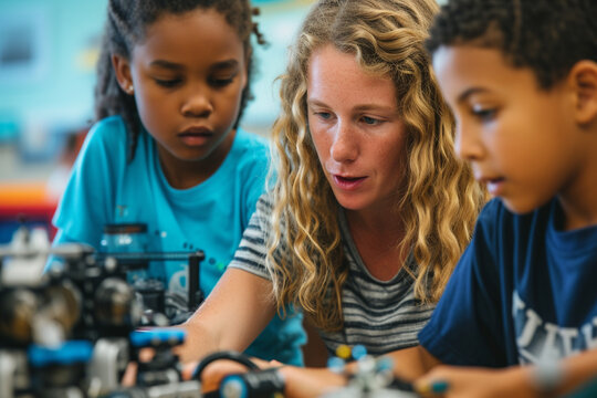 Elementary school coding: Teacher demonstrating mechanical robot programming to engaged young students during classroom STEM activity