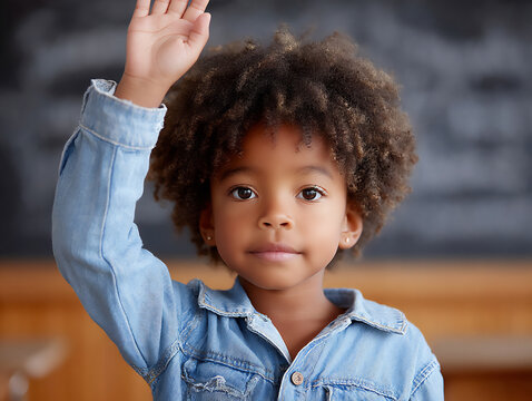 The enthusiastic child raising her hand in a vibrant classroom setting.