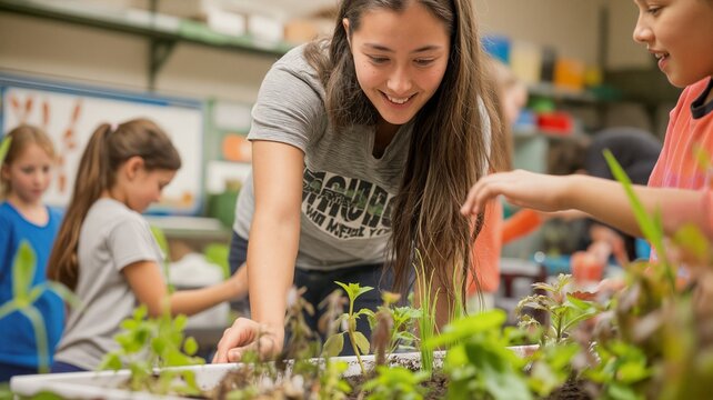 Young Female Teacher Leading an Interactive Gardening Lesson in a Classroom