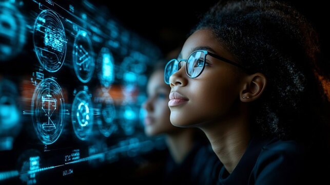 Children and teacher using tablets with digital data visualization