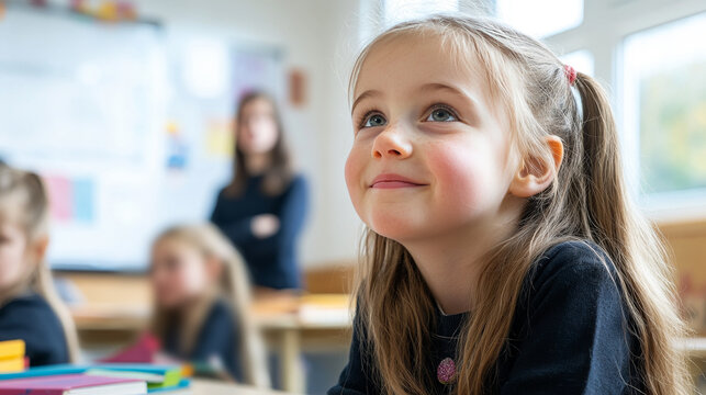 Young girl engaged in classroom learning while teacher supervises students in bright educational environment
