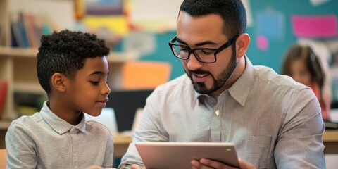Male teacher guiding young schoolboy on digital tablet use in classroom