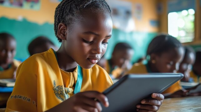 A child using interactive educational software on a tablet while sitting at a desk in a bright classroom