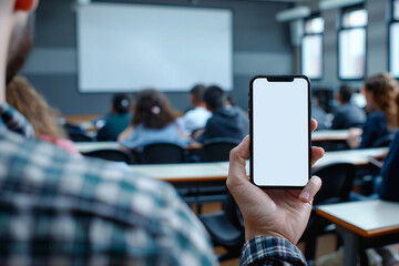 Innovative student teacher using smartphone for interactive learning in modern classroom setting,