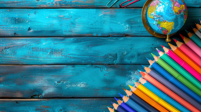 blue whiteboard with markers on a grey background, teaching tools banner with copy space area for text and design elements