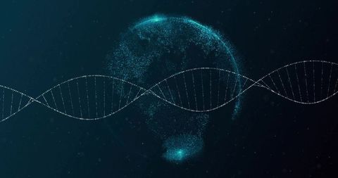 Digital dna helix connecting global data with particle globe technology background concept