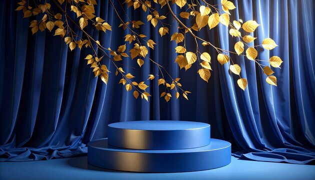 Blue podium with golden leaves and curtains in elegant showcase setting