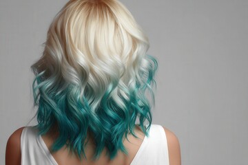 A striking teal ombre highlights a woman's wavy blonde hair against a neutral backdrop.
