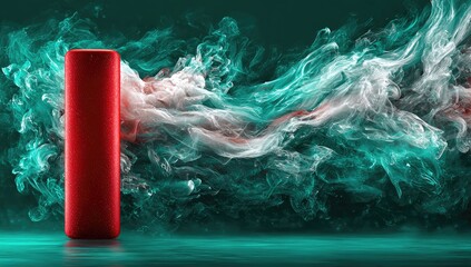 Red cylinder product, teal and white smoke background