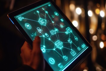 A hand holds a tablet displaying a futuristic network interface with glowing icons, representing data connectivity and digital interaction.
