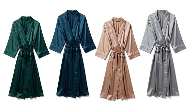 Four silk robes, various colors and patterns, hung on wooden hangers
