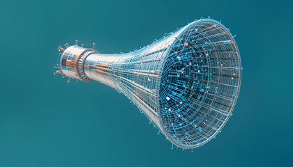 Futuristic digital structure composed of connected wires and nodes on a clean teal backdrop evokes technology concepts.