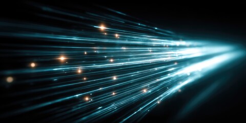 Abstract digital data flow visualization. Dynamic patterns of glowing teal data points form lines, waves in dark background. Futuristic tech concept. Represents information processing. Modern design.
