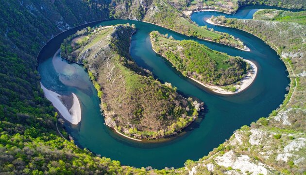 Sunset river meander over rural valley with sandbars, village road and mountain ridges