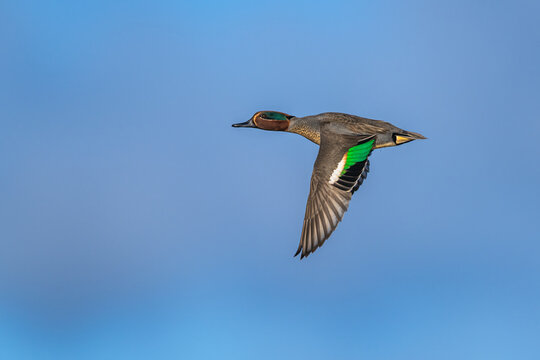 Green winged teal duck standing up, showing colorful feathers on pond.