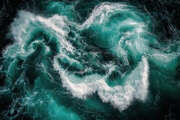 turbulent ocean water with white foamy waves forming swirling patterns over deep teal sea