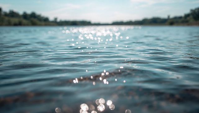 Shimmering lake surface reflecting sunlight with teal ripples and soft bokeh