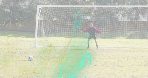 Goalkeeper defending goal on worn grass with soccer ball and teal light leak