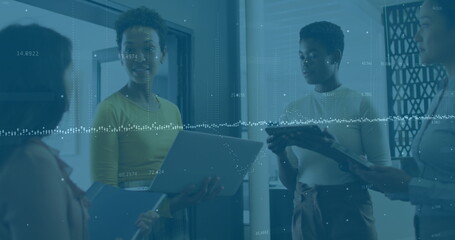 Image of data processing over diverse business people talking in office