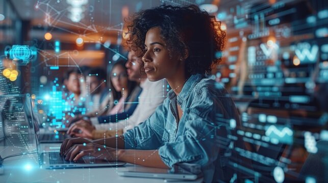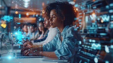 Diverse group of data scientists collaborating on a complex project late at night in a tech office