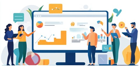 A digital marketing team evaluating the effectiveness of current trends on a large touchscreen