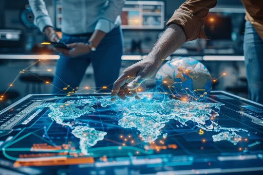 Corporate Team Collaborating on Financial Project. Team of professionals works on a high-tech financial project using digital tablets and interactive analytics in a corporate environment.
