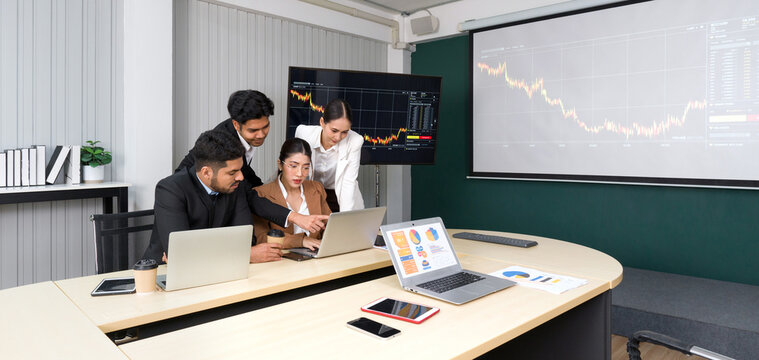 Group of business people in suit analyze stock information in the meeting room. Business executives team meeting in modern office with laptop computer, tablet, mobile phone on table.