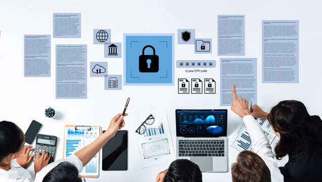 A business team collaborates on strategies for cybersecurity, reviewing documents and data on screens, emphasizing the importance of secure information management in today digital age. Gantry
