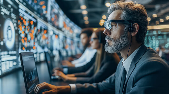 Futuristic Business Meeting With Augmented Reality Overlays. Professionals Analyze Holographic Data Projections, Charts on a Table Filled With Documents, Laptops, and Interactive Digital Displays.