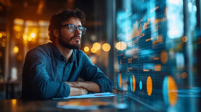 Professional man with glasses and light beard points to a detailed data chart on a whiteboard. Image captures focus on data analysis, strategic planning, and corporate communication.