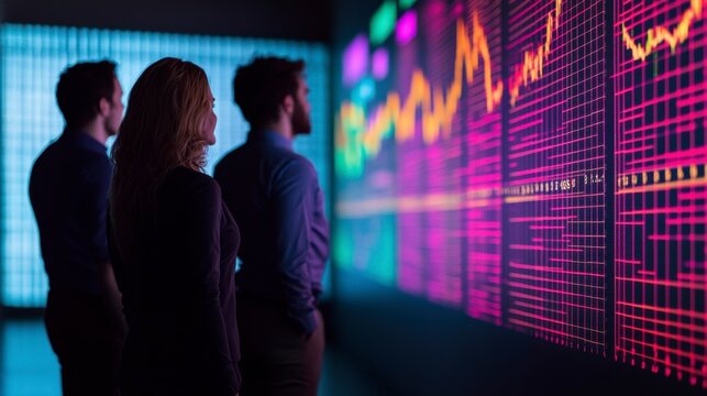 Team Engaged in Brainstorming Session Analyzing Financial Data with Colorful Graphs on a Digital Screen in a Modern Office Environment