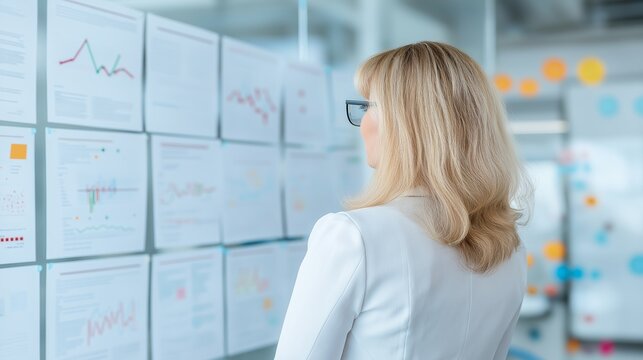 Professional woman analyzing data graphs and reports in a modern office environment during the daytime