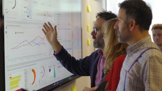 Businessman pointing at colorful data charts on a display board in a modern office setting