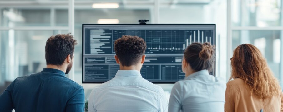 Team Analyzing Data Back View of Colleagues at Screen in Modern Office , Analytics, Teamwork
