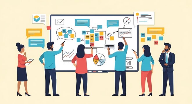Collaborative team analyzing business data on corkboard