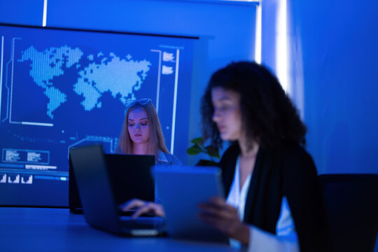 Business professionals engaging in a meeting, analyzing data and world map on a high-tech interactive screen in a dark room.