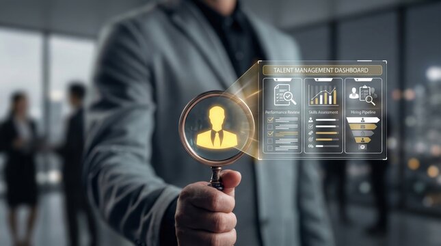 Businessman using magnifying glass to analyze employee performance,skills assessment,hiring pipeline on futuristic talent management dashboard