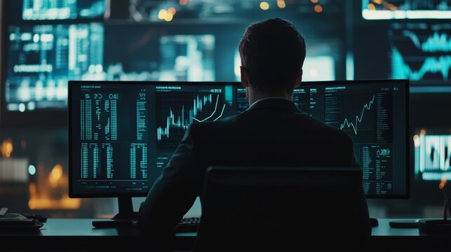Data analysis in a modern office setting financial market research digital workspace nighttime environment professional viewpoint
