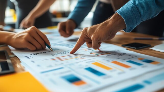 Business team analyzing graphs on a desk. Hands pointing at data charts, discussing strategy and financial growth in a modern office setting.