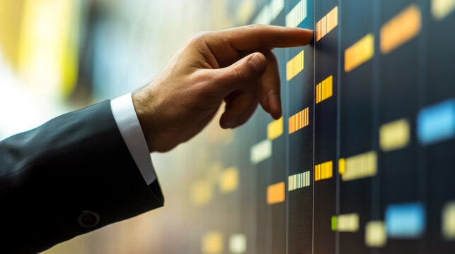 A businessman wearing glasses analyzes data on a computer screen, with charts and graphs, in a modern office setting.