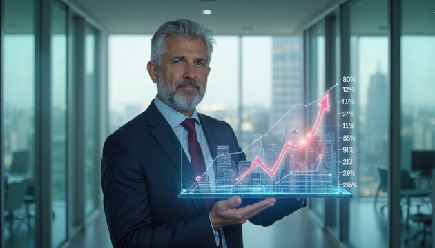 Middle-aged Caucasian businessman in a sharp suit holding a holographic virtual graph displaying upward trends in real estate market growth