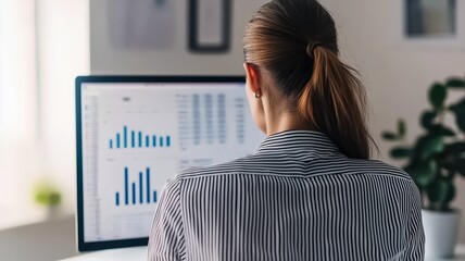 A professional business woman analyzing data on a computer screen, showcasing graphs and charts in a modern office setting.