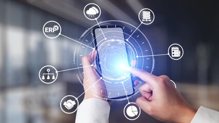 ERP icons show management, integration, and business process. ERP supports data management, ERP efficiency, and ERP organizational solutions. Gist