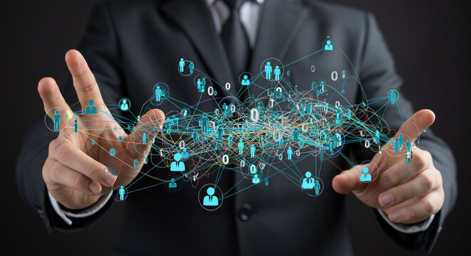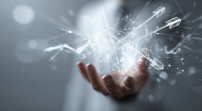 Person's hand grasping digital arrows. Concept of growth, connections & data