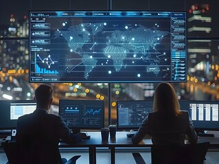 Silhouettes of business professionals standing in front of a large screen displaying global data and a world map