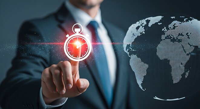 Businessman Touching Stopwatch Icon with Globe Overlay for Global Business Strategy.