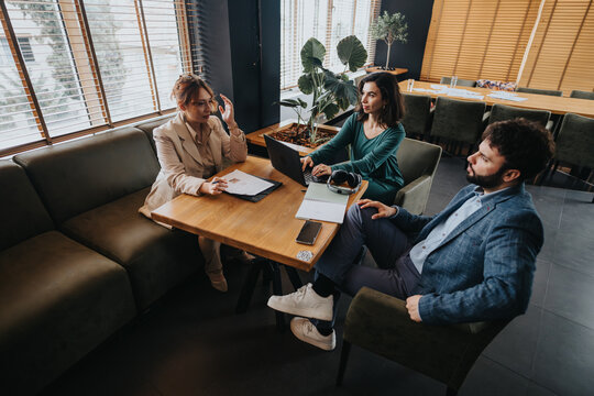 Diverse team analyzing reports in modern office lounge